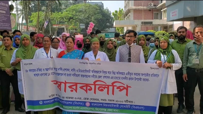 স্বাস্থ্যসেবার অন্যতম গুরুত্বপূর্ণ স্তম্ভ নার্সিং ও মিডওয়াইফারি প্রশাসনকে তিনটি অধিদপ্তরের সঙ্গে একীভূত করার সরকারি উদ্যোগের প্রতিবাদে এবং ৪৮ বছর ধরে প্রতিষ্ঠিত স্বাধীন কাঠামো পুনর্বহালসহ আট দফা দাবিতে জেলা প্রশাসকের মাধ্যমে প্রধান উপদেষ্টা বরাবর স্মারকলিপি প্রদান করেছে বাংলাদেশ নার্সেস অ্যাসোসিয়েশন (বিএনএ) ও বাংলাদেশ মিডওয়াইফারি সোসাইটি (বিএমএস) এর কিশোরগঞ্জ জেলা শাখার নেতাকর্মীরা।