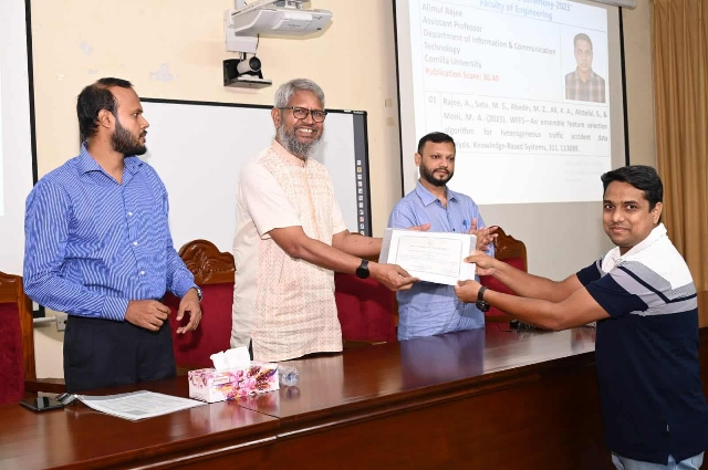 কুমিল্লা বিশ্ববিদ্যালয়ের (কুবি) গবেষণা ও সম্প্রসারণ দপ্তরের আয়োজনে ‘গবেষণা প্রণোদনা অনুষ্ঠান-২০২৫’ এর আয়োজন করা হয়েছে। এতে বিজ্ঞান অনুষদের ৫ জন, কলা ও মানবিক অনুষদের একজন, সামাজিক বিজ্ঞান অনুষদের একজন, ব্যবসায় শিক্ষা অনুষদের তিনজন এবং প্রকৌশল অনুষদের দুজনসহ মোট ১২ জন শিক্ষককে সার্টিফিকেট ও পাঁচ লক্ষ নব্বই হাজার টাকা প্রণোদনা হয়েছে।