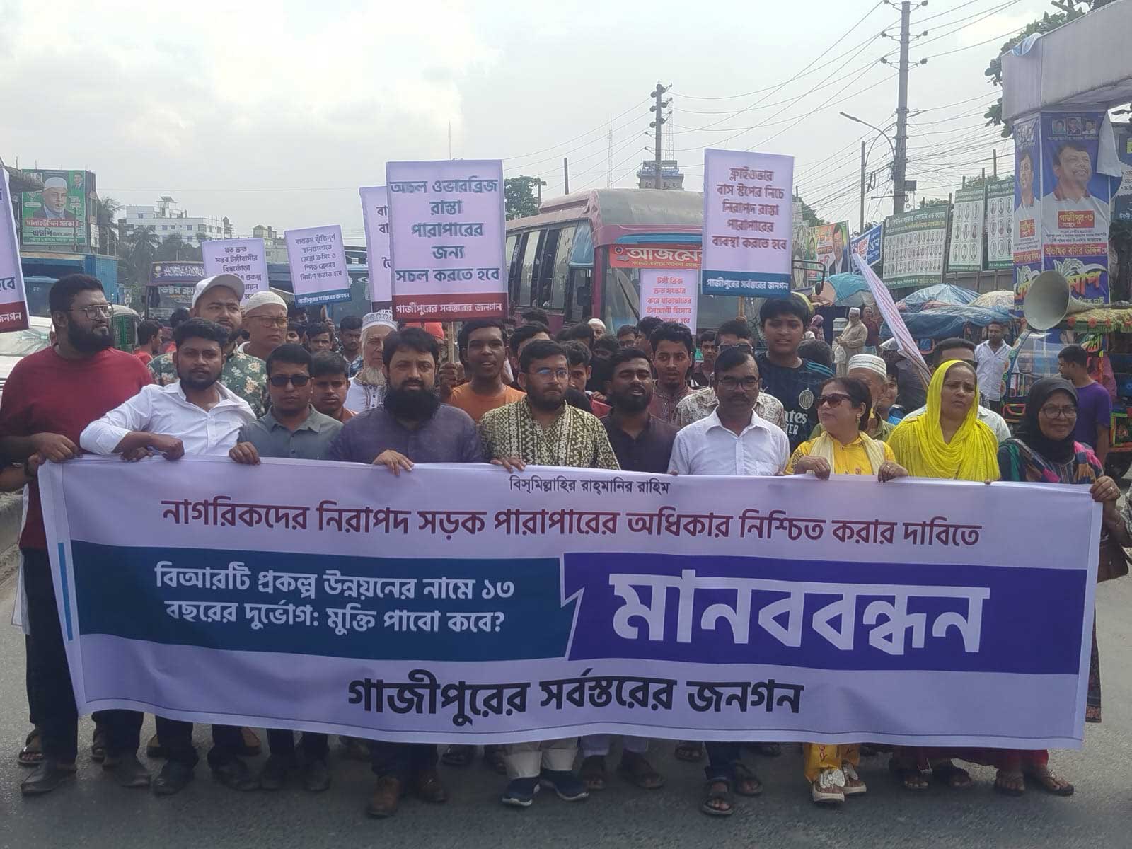 গাজীপুরে বিআরটি (বাস র্যাপিড ট্রানজিট) প্রকল্পের নামে টানা ১৩ বছর ধরে চলমান উন্নয়ন কাজের ধীরগতি, অনিয়ম ও দুর্নীতির প্রতিবাদে এবং জনদুর্ভোগ থেকে মুক্তির দাবিতে সর্বস্তরের জনগণ এক মানববন্ধন কর্মসূচি পালন করেছে।