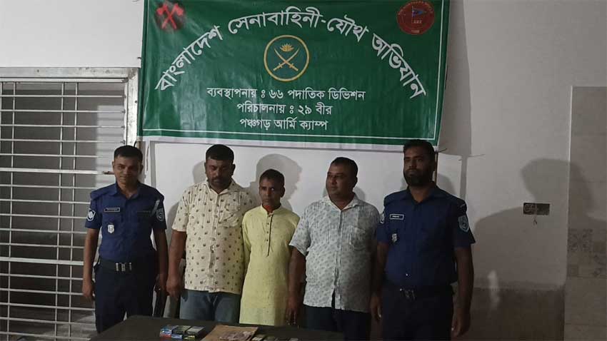 অভিযানে আটক হন— গোলাম মোস্তফার ছেলে মনির হোসেন (৫৪), মাহবুব আলমের ছেলে রুবেল (৪৯) এবং আব্দুল মজিদের ছেলে মাসুদ রানা (৪৫)। তারা সবাই পঞ্চগড় পৌরসভার বাসিন্দা। ঘটনাস্থল থেকে জব্দ করা হয় ৬,৫২০ টাকা নগদ, ছয় সেট তাসের কার্ড এবং তিনটি মোবাইল ফোন।