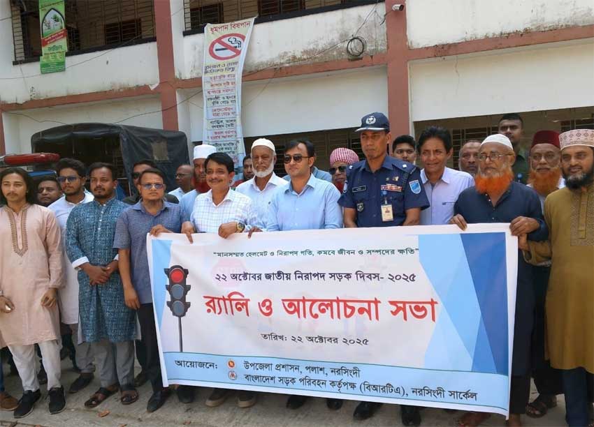 সভা শেষে “মানসম্মত হেলমেট ব্যবহার ও নিরাপদ গতি—কমাবে জীবন ও সম্পদের ক্ষতি” এই প্রতিপাদ্যকে সামনে রেখে জাতীয় নিরাপদ সড়ক দিবস-২০২৫ উপলক্ষে এক বর্ণাঢ্য র্যালির আয়োজন করে পলাশ উপজেলা প্রশাসন ও বাংলাদেশ সড়ক পরিবহন কর্তৃপক্ষ (বিআরটিএ) নরসিংদী সার্কেল।