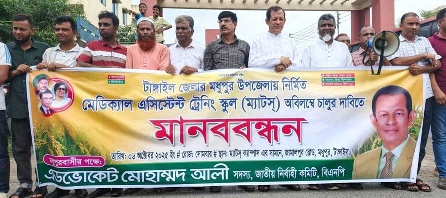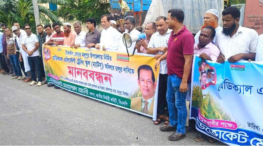 টাঙ্গাইলের মধুপুরে মেডিক্যাল এসিস্ট্যান্ট ট্রেনিং স্কুল(ম্যাটস) অবিলম্বে চালুর দাবীতে মানবন্ধন করেছে টাঙ্গাইল-১(মধুপুর-ধনবাড়ী) আসনের বিএনপি’র মনোনয়ন প্রত্যাশী অ্যাডভোকেট মোহাম্মদ আলী সহ তার পক্ষের লোকজন ও এলাকার জনসাধারণ।