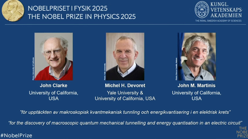 এ বছর পদার্থবিজ্ঞানে যৌথভাবে নোবেল পেয়েছেন জন ক্লার্ক, মিশেল দেভরেট ও জন এম মার্টিনিস। তারা ইউনিভার্সিটি অব ক্যালিফোর্নিয়ার গবেষক। মঙ্গলবার বাংলাদেশ সময় বিকেলে পৌনে ৪টার দিকে তাদের নাম ঘোষণা করে নোবেল কমিটি। বৈদ্যুতিক সার্কিটে ম্যাক্রোস্কোপিক কোয়ান্টাম মেকানিক্যাল টানেলিং ও শক্তি পরিমাপ আবিষ্কারের জন্য এবারের পদার্থবিজ্ঞানে নোবেল পেলেন তারা।
