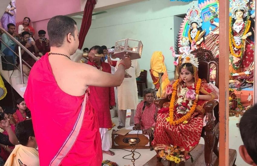 ‘কুমারী মায়িকি জয়, দুর্গা মায়িকি জয়’ ধ্বনিতে কুমারী দেবীকে মণ্ডপে আনা হয়। এ সময় দুর্গা প্রতিমার সামনে কুমারী দেবীর বেদি স্থাপন করা হয়। এতে জীবন্ত দুর্গাকে প্রতিষ্ঠিত করা হয়। পূজা শুরুতেই মন্ত্রপাঠ ও প্রার্থনা করা হয়। পরে পঞ্চ উপকরণে কুমারী দেবীকে আরাধনা করেন পুরোহিত ও ভক্তরা।