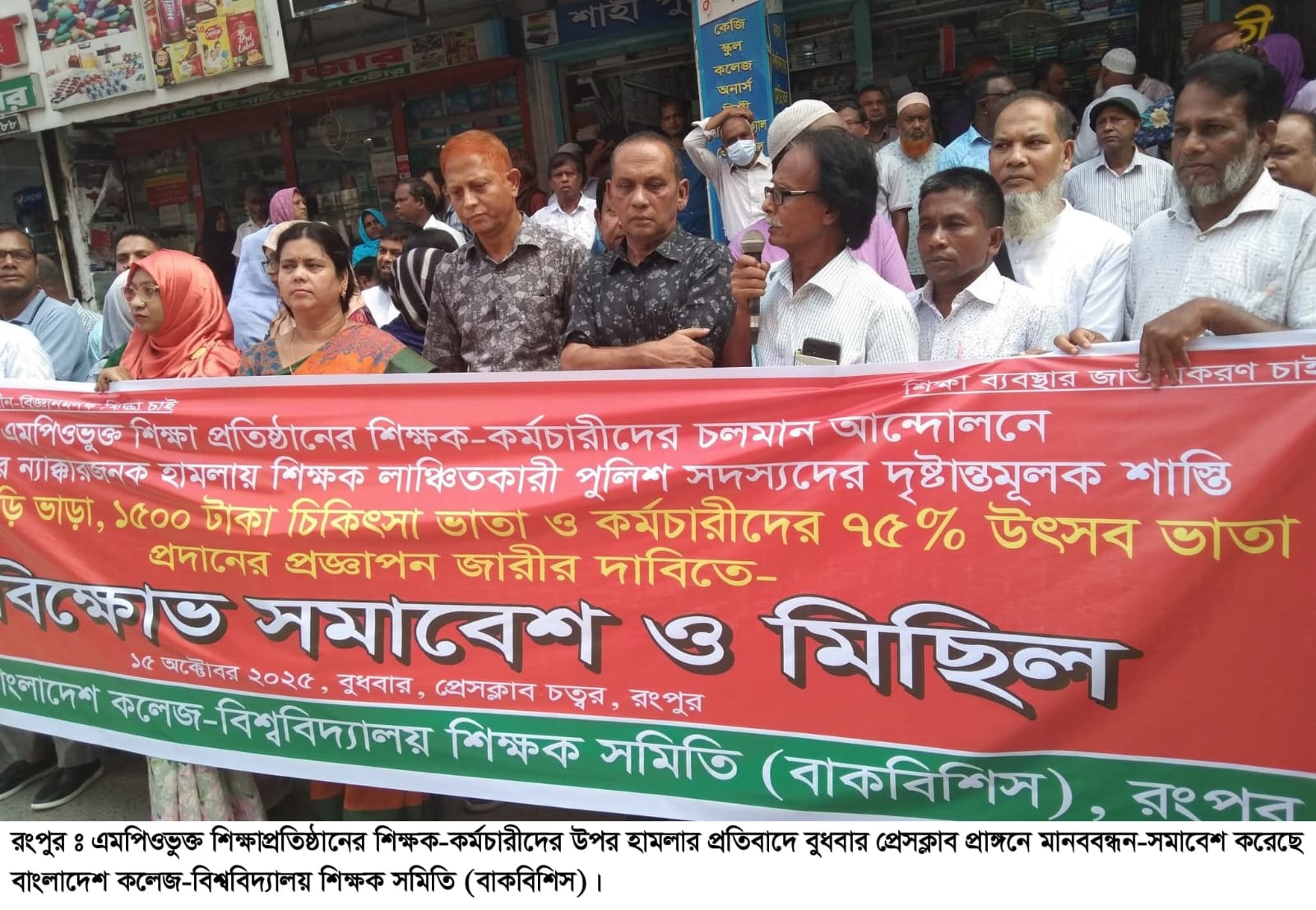 ঢাকায় এমপিওভুক্ত শিক্ষাপ্রতিষ্ঠানের শিক্ষক-কর্মচারীদের উপর হামলার প্রতিবাদে রংপুরে মানববন্ধন-সমাবেশ করেছে বাংলাদেশ কলেজ-বিশ্ববিদ্যালয় শিক্ষক সমিতি (বাকবিশিস)।