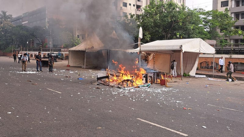 পুলিশকে সেখানে অবস্থানকারীদের লাঠিপেটা করতে দেখা যায়। এ সময় ‘জুলাই যোদ্ধাদের’ কয়েকজন আহত হয়েছে। তাঁদেরকে হাসপাতালে নিয়ে যেতে দেখা গেছে। পরে ‘জুলাই যোদ্ধারা’ বাইরে গিয়ে বিক্ষোভ করে এবং কয়েকটি যানবাহন ভাঙচুর করে। একপর্যায়ে একদল ব্যক্তি আবার মঞ্চের দিকে ঢুকে যায়। এ সময় পুলিশ আবার তাদের সরিয়ে দেয়।