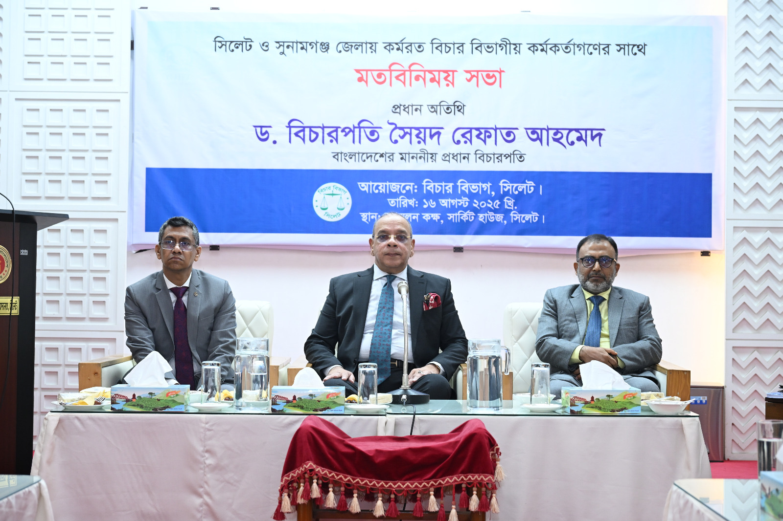 শনিবার (১৬ আগস্ট ২০২৫) বিকাল ৪:৩০ টায় সিলেট সার্কিট হাউজে সিলেট ও সুনামগঞ্জ জেলার জেলার জেলা ও দায়রা জজ আদালত, মহানগর দায়রা জজ আদালত, চীফ জুডিসিয়াল ম্যাজিস্ট্রেট আদালত, চীফ মেট্রোপলিটন ম্যাজিস্ট্রেট আদালত, শ্রম আদালতে কর্মরত বিভিন্ন পর্যায়ের বিচার বিভাগীয় কর্মকর্তাগণসহ সিলেট ও সুনামগঞ্জ জেলার বিভিন্ন ট্রাইব্যুনালের বিচারকবৃন্দের সাথে বাংলাদেশের প্রধান বিচারপতি জনাব ড. সৈয়দ রেফাত আহমেদ এর এক মতবিনিময় সভা করেন।