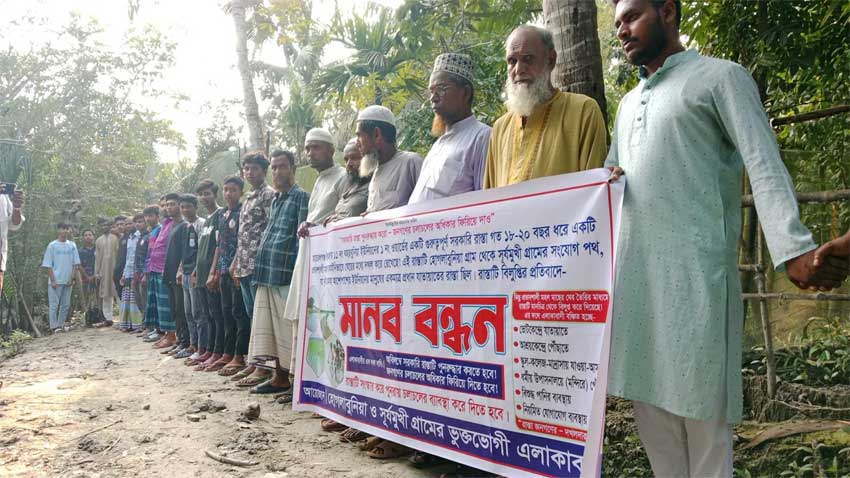শুক্রবার (১৭ অক্টোবর) বিকেলে হোগলাবুনিয়া ফরাজি বাড়ি জামে মসজিদ থেকে সূর্যমুখী কে.পি. সরকারি প্রাথমিক বিদ্যালয় পর্যন্ত সংযোগকারী প্রায় ১০ কিলোমিটার দীর্ঘ কাঁচা সড়কের সামনে এই মানববন্ধন অনুষ্ঠিত হয়।