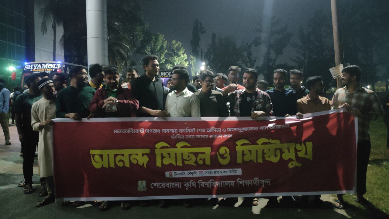 শেখ হাসিনার মৃত্যুদণ্ডের রায়: শেকৃবিতে আনন্দ মিছিল ও মিষ্টি বিতরণ