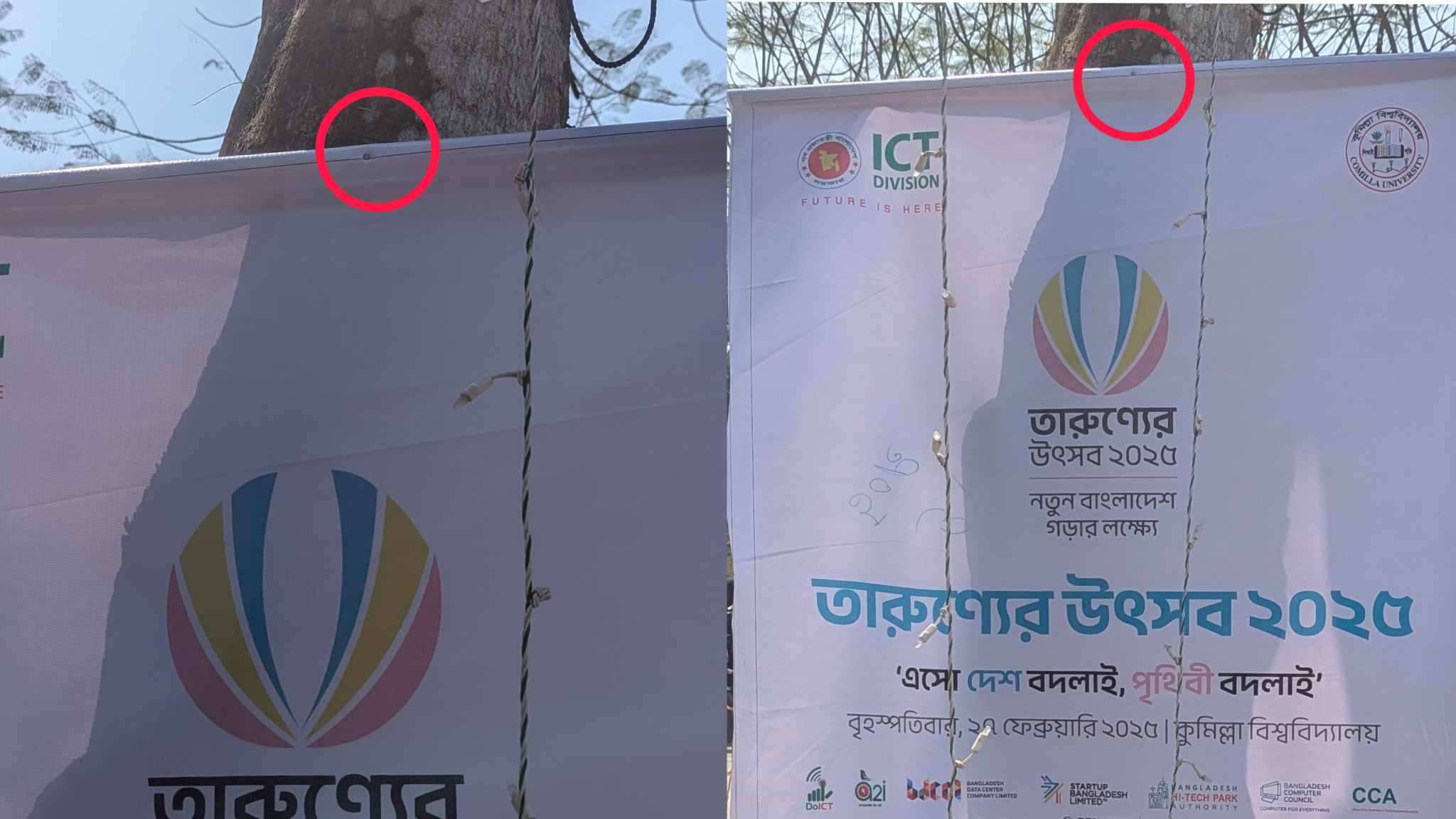 গাছে পেরেক মেরে তারুণ্যের উৎসবের প্রচারণা,আইন অমান্য কুবি প্রশাসনের