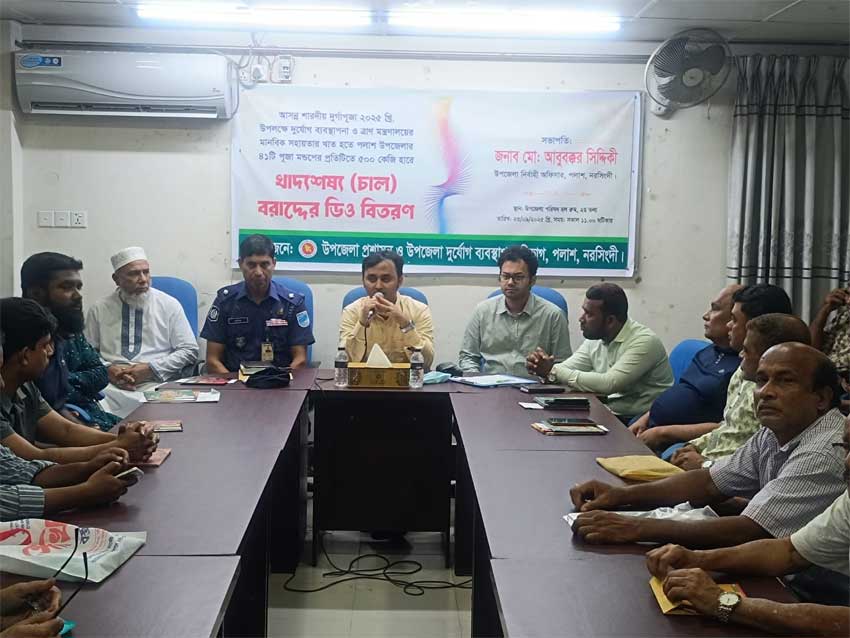 পলাশে দুর্গাপূজা উপলক্ষে দুর্যোগ ব্যবস্থাপনা অধিদপ্তর পক্ষ থেকে ৪১ টি মন্ডবে চাল বিতরন
